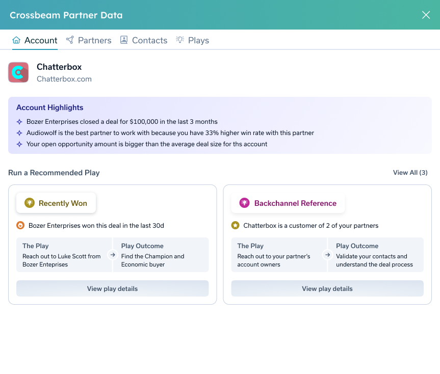 - Partner overlaps: Ecosystem Intelligence signals — like win rates and average deal size — help you quickly identify the best partners to give you a warm intro or keep stalled deals moving.
