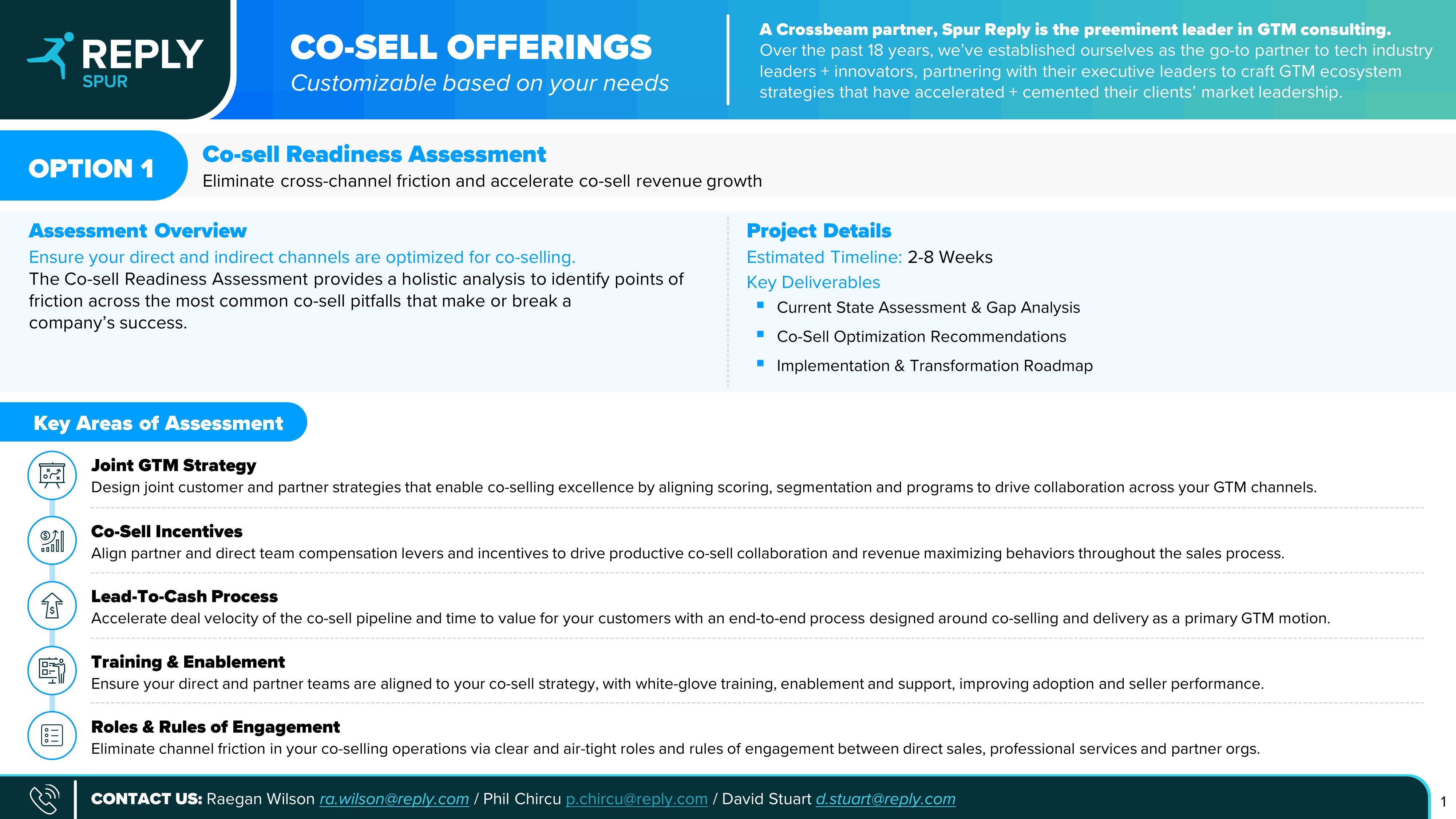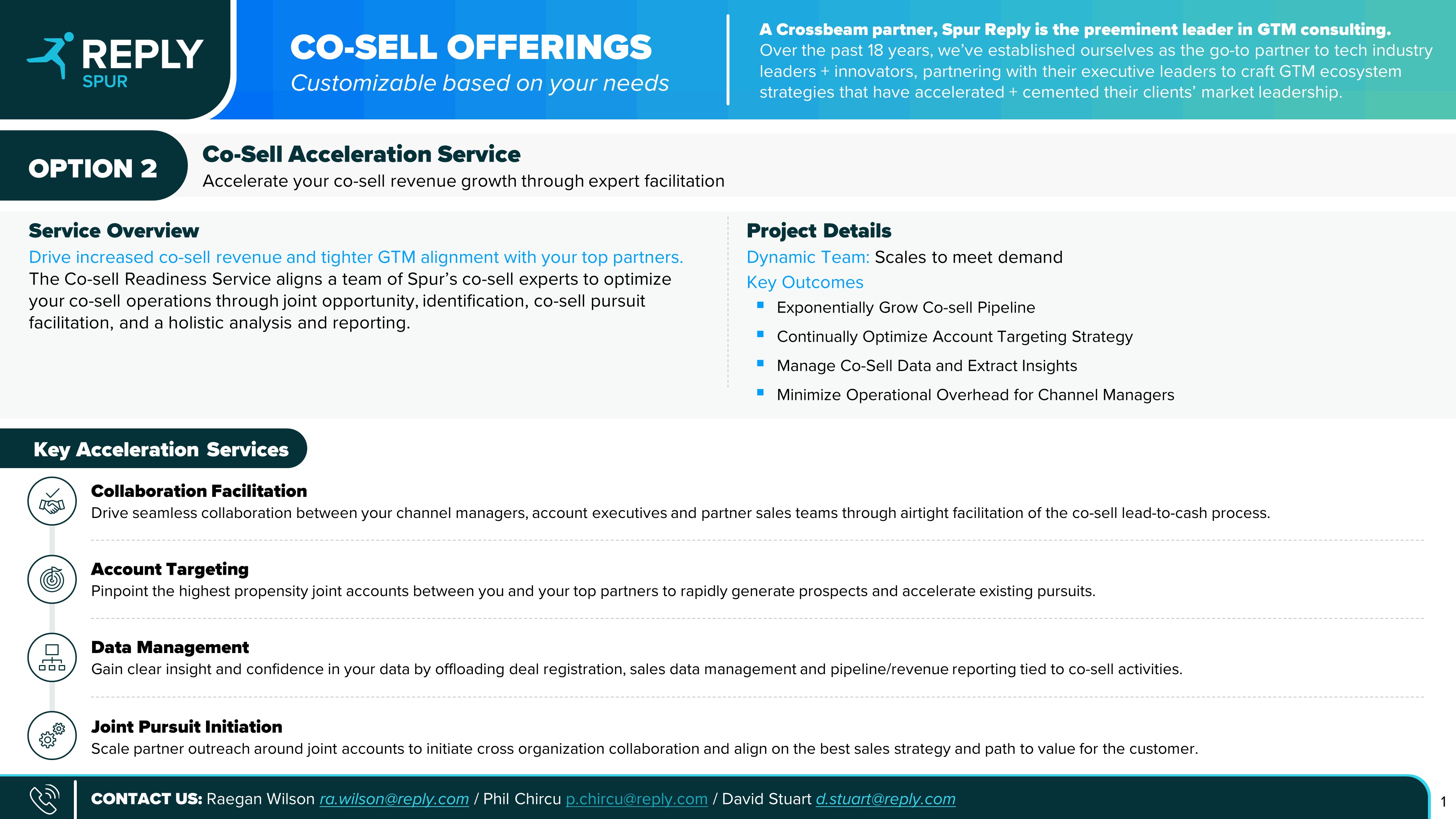 Co-Sell Acceleration Service: The Co-Sell Acceleration Service aligns a team of Spur’s co-sell experts to optimize your co-sell operations through joint opportunity, identification, co-sell pursuit facilitation, and a holistic analysis and reporting.